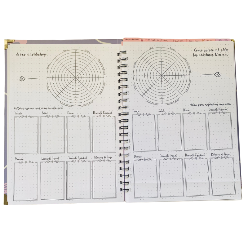 Este hermoso ejercicio que usan muchos Coach de vida viene en tu No Agenda, y te acompaña durante todo el año para que estes en constante auto observación de las áreas más importantes de cada ser humano: Familia, salud, finanzas, relaciones, desarrollo personal y profesional, diversión y espiritualidad. Descubre dónde estás, qué necesitas cambiar y fija metas claras que te llevarán a un cambio profundo. -