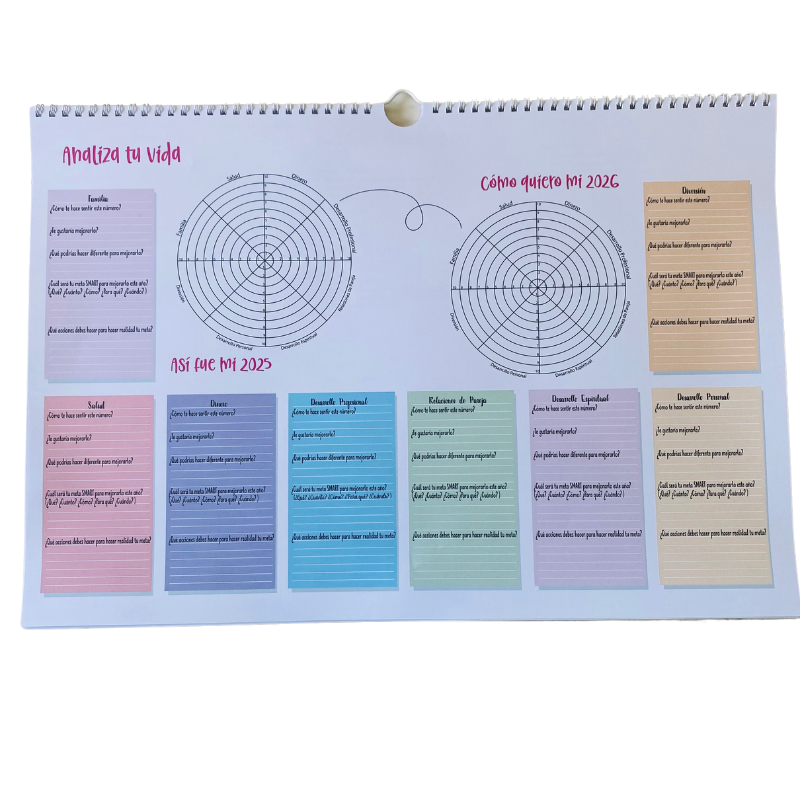 En la primera hoja encontrarás este ejercicio clásico del coaching, donde podrás reflexionar sobre cómo fue tu 2025 y proyectar tu 2026 en las 8 áreas fundamentales de tu vida. Este ejercicio te ayuda a ganar claridad, equilibrar tus prioridades y definir metas realistas y alcanzables. -