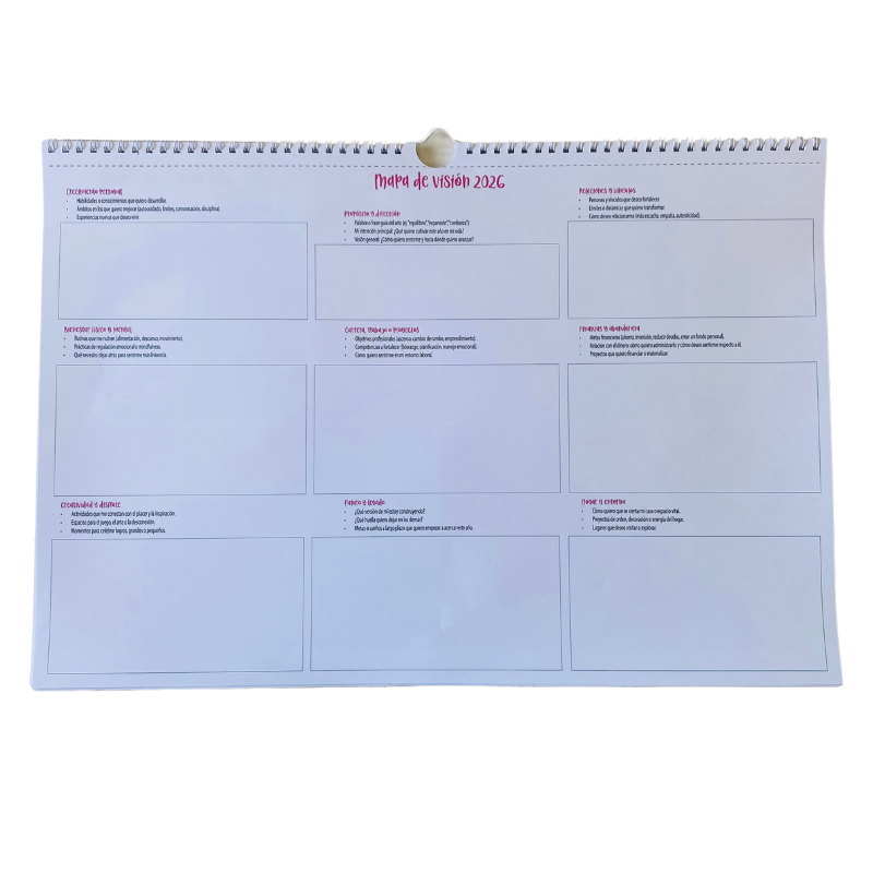 Un planificador anual donde, en una sola hoja, podrás ver todo el año 2026: las grandes metas mes por mes, lo que quieres lograr de vista global antes de entrar en los detalles mensuales. Porque planificar de lo general a lo específico aumenta la claridad y coherencia de tu acción. -